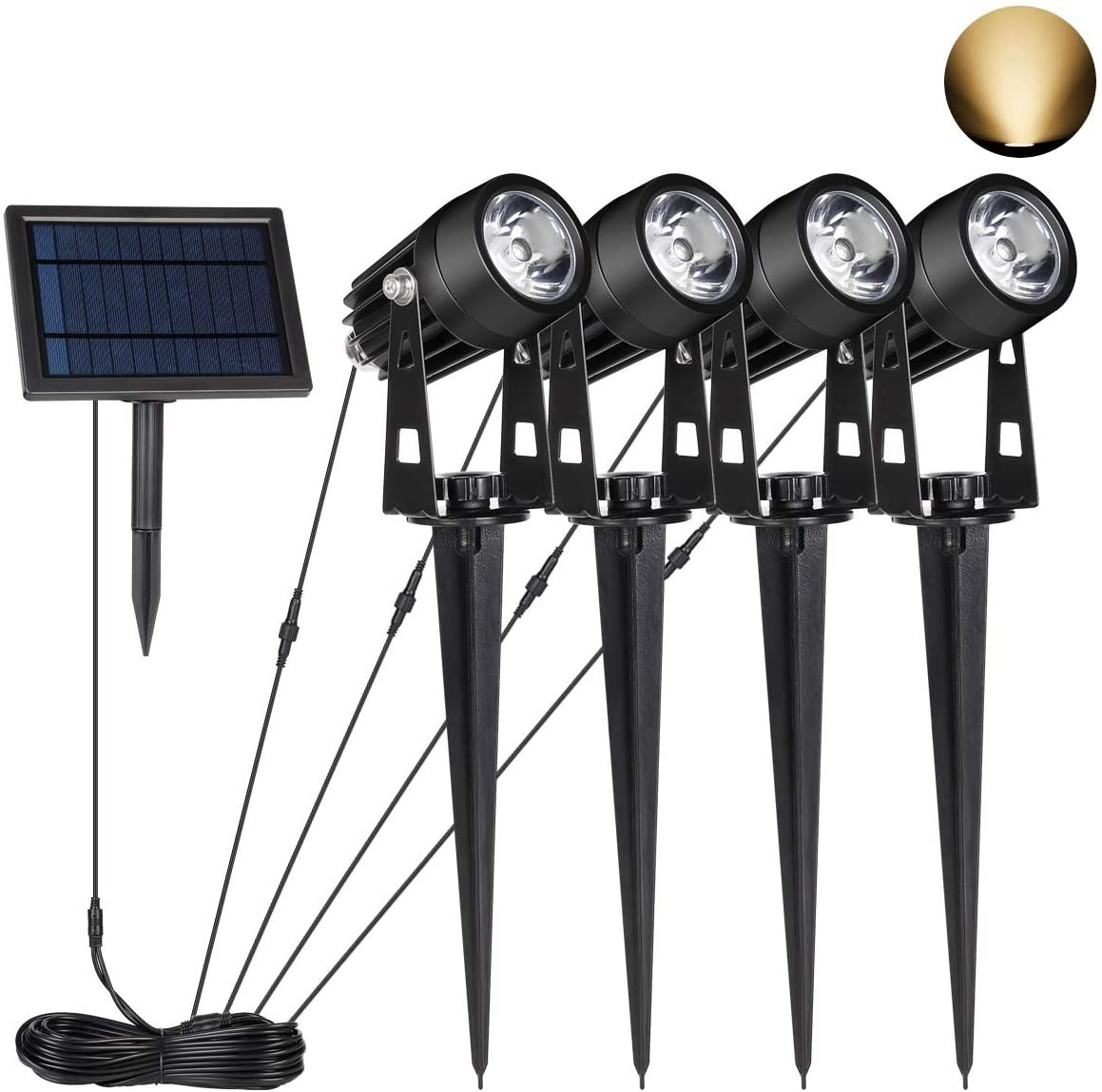 Onze complete set tuinspots op zonne-energie zijn met losse kabels verbonden aan het zonnepaneel.