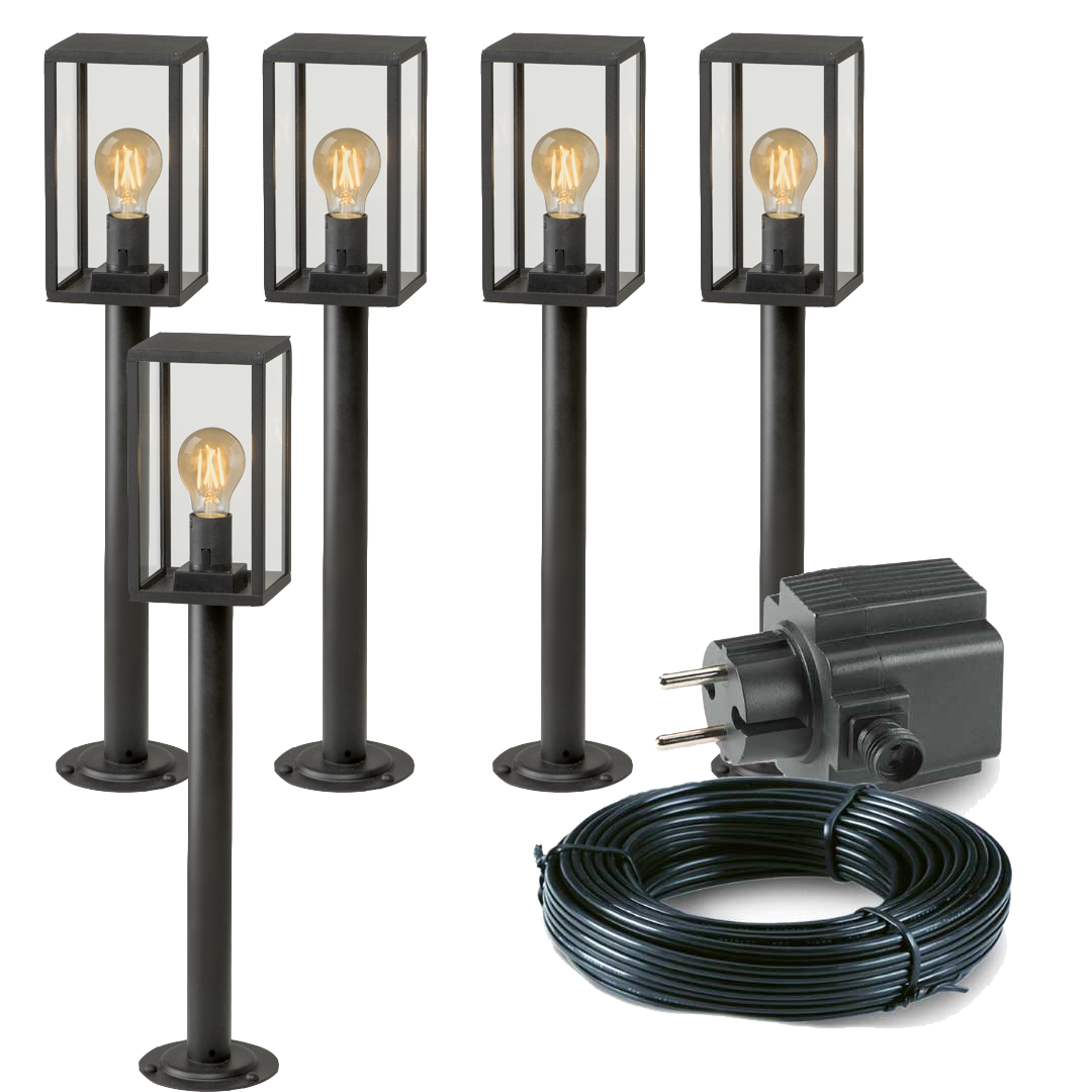 Een complete plug & play set met 5 sokkel tuinlampen van 68cm