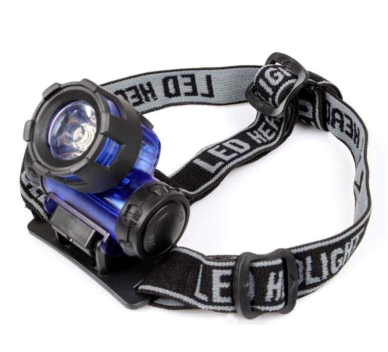 Mooie lichtgewicht hoofdlamp. Blauwe behuizing en zwart band. De band is in lengte verstelbaar en elastisch.