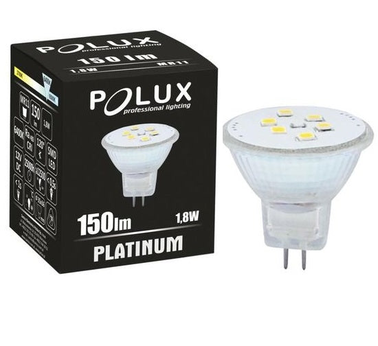 LED MR11 lamp. Deze lamp heeft een diameter van 35mm ipv 50 mm zoals een normale MR11. De lamp heeft een lichtsterkte van 150 lumen en vervangt daarmee een 16W halogeen lamp. Uniek aan deze LED lamp is zijn hoge kleurweergave, CRI, van ≥ 80. Het licht schijnt in een hoek van 120° met een warm witte lichtkleur van 3000K. De LED lampen uit de serie Polux zijn voorzien van de nieuwste technologie SMD LED's welke garant staan voor een perfecte kwaliteit en een verwachte levensduur van 30.000 branduren.