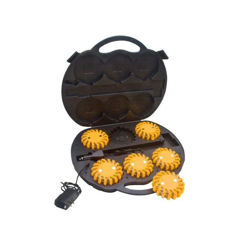 Set van 6 oranje oplaadbare LED-bakens, geleverd in handige opbergkoffer incl. 12-24V oplader voor sigarettenaansteker en 230V lader voor stopcontact.