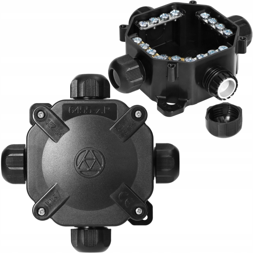 Waterproof and dustproof square junction box with IP67 certification, 4 cable glands, and 5 removable jumpers. Suitable for star and delta connections, among others.