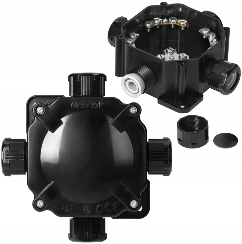 Waterproof and dustproof square junction box with IP67 certification, 4 cable glands, and 5 removable jumpers. Suitable for star and delta connections, among others.