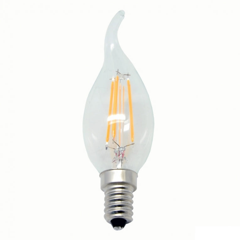 Retro Vlamvormige filament LED-lamp en E14-fitting, 380 lumen en een zeer laag energieverbruik van 3,5 watt, ter vervanging van de traditionele 40-watt gloeilampen en voor directe energiebesparing. Deze lamp bespaart zelfs meer energie dan traditionele LED-lampen. De lamp verspreidt een warm wit licht met een kleurtemperatuur van 2900 kelvin.