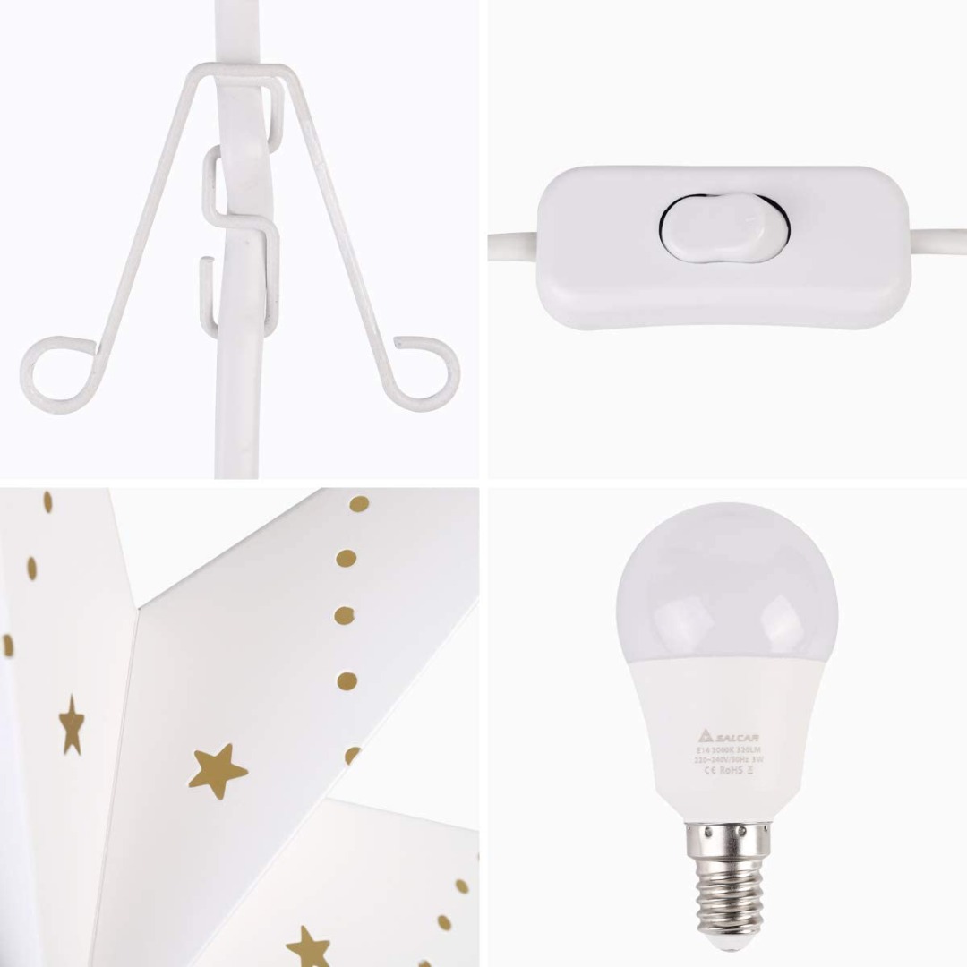 Deze ster is een prachtige toevoeging voor uw kerstdecoraties. De ster wordt netjes opgevouwen aan u geleverd, die u dan vervolgens gemakkelijk kunt uitvouwen tot een 3D-ster. Daarna kunt u de meegeleverde E14 LED lamp in de bijbehorende fitting stoppen en vervolgens de ster om de lamp heen doen. Het enige wat u nu nog moet doen is de stekker in het stopcontact steken, en u bent klaar! De LED lamp produceert een aangenaam warm wit licht (3000K), waardoor u met deze ster een knusse sfeer creëert die perfect bij de kerst past. Dankzij de lange voedingsdraad kunt u de ster bijvoorbeeld voor het raam hangen, maar eigenlijk ook op elke andere gewenste plek.