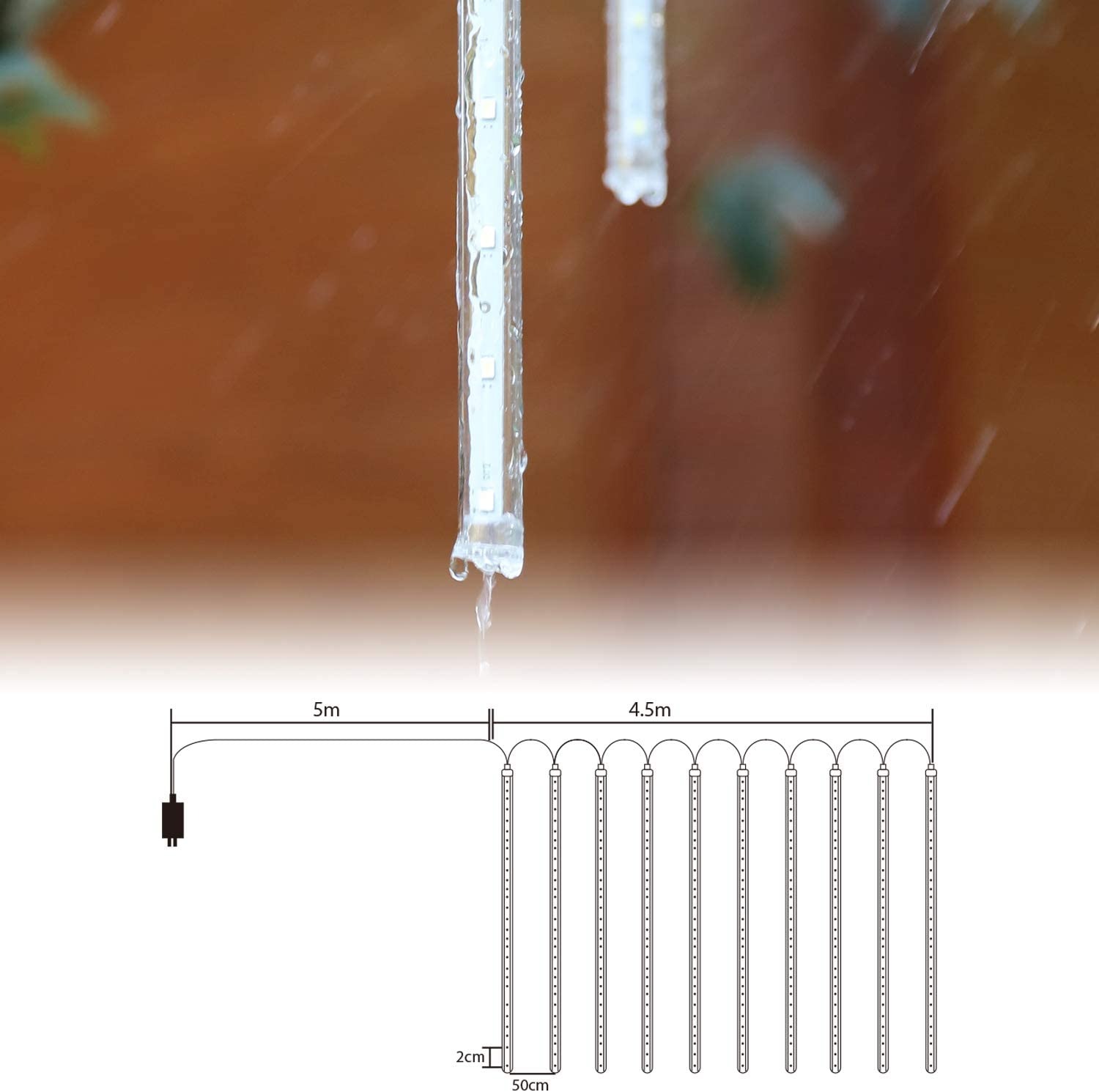 50 cm per buis, 36 leds per buis, 4,5 m led-lichtketting + 5 m stroomkabel